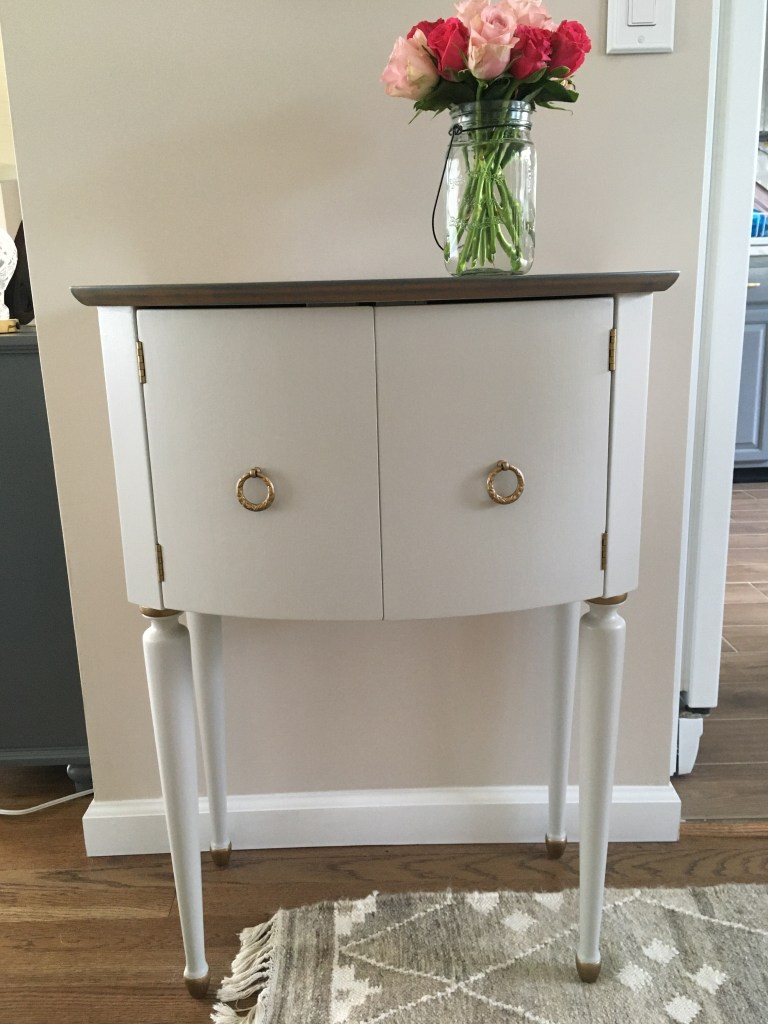 Accent Table: You’ll need, sand paper (medium and fine), stain (I used Varathane in Weathered Gray*) and three coats of clear, satin polyurethane. Varathane and Minwax both make nice products. For the handles and hinges I used Rustoleum Spray Paint in Metallic Champagne Bronze. I used foam brushes to complete this project.