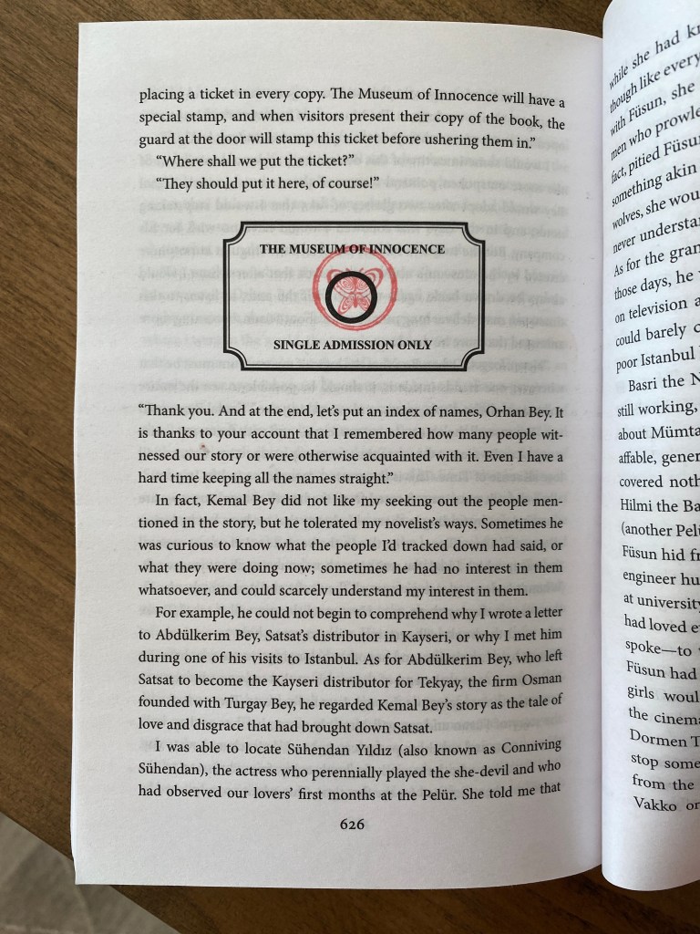 Last week, I was fortunate enough to be able to travel overseas to Türkiye and during my travels there, visit The Museum of Innocence (Masumiyet Müzesi) in the Çukurcuma neighborhood of the Beyoğlu district in Istanbul. The museum, which opened in April 2012 and contains more than one thousand objects, was created in tandem with Orhan Pamuk’s 2008 novel of the same name (Pamuk recently released a series on Netflix based on the novel as well). Admission to the museum is free to those who own the book, which contains a printed ticket that is stamped upon entry. Being that I brought my book with me, I now have a special keepsake of my visit.